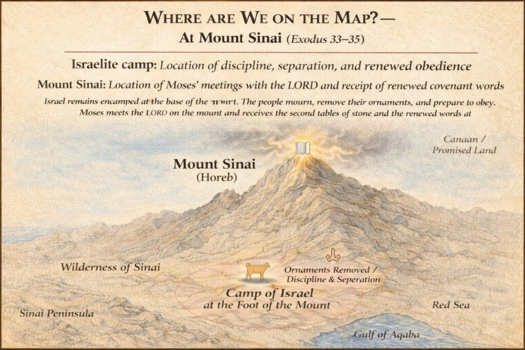 - Israel remains in the Sinai encampment during this restoration period (Exod 19:2; 35:1).