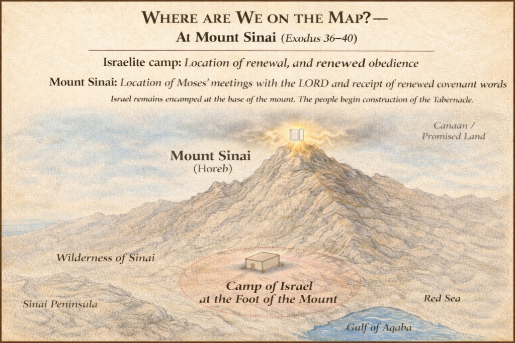 - Israel remains encamped at Sinai while the work proceeds (Exod 19:2; 35:1).
