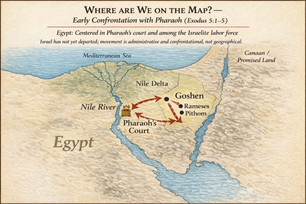 - Egypt: Centered in Pharaoh’s court and among the Israelite labor force (Exod 5:1–5).